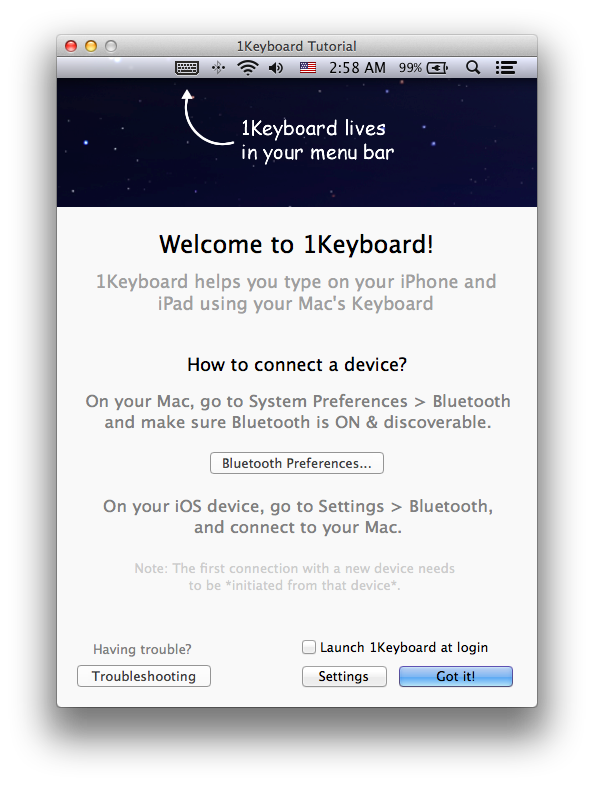 Turn your Mac into a Bluetooth keyboard that works with all of your devices.Use keyboard shortcuts to start typing on devices.