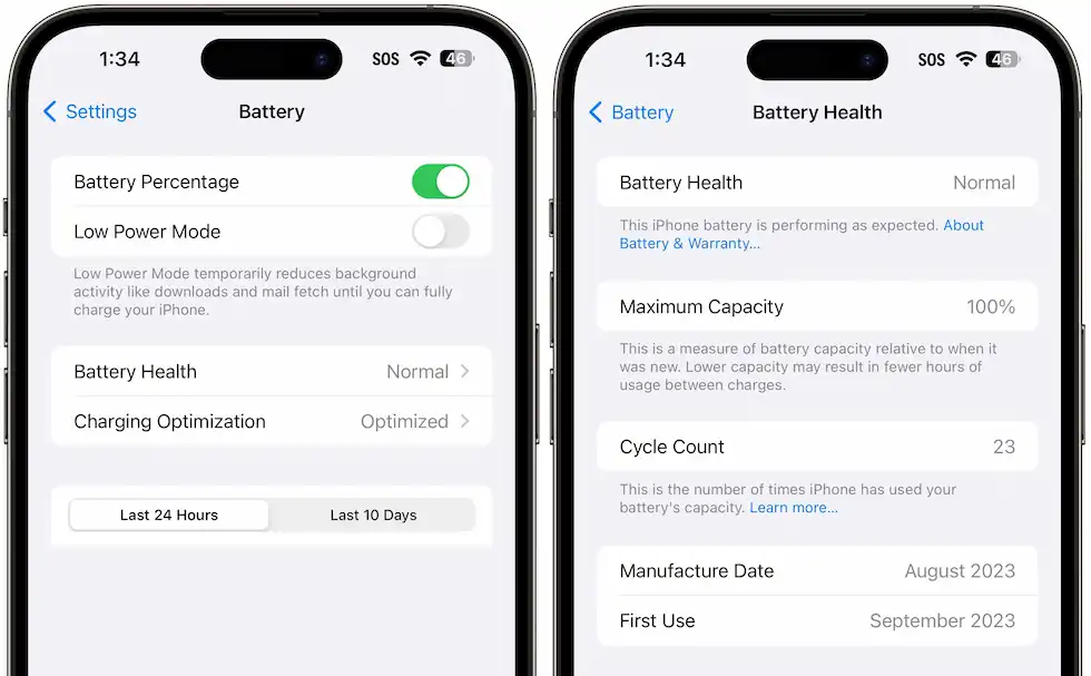 Procentul pentru sănătatea bateriei a fost mutat în interiorul meniului, iar capacitatea lui va fi afișată în procente conform unor calcule raportate la numărul de cicluri de încărcare și limita de 1000 de încărcări a bateriei. Tot în acest meniu posesorii de iPhone 15 pot vedea data fabricării bateriei, precum și data primei utilizări.