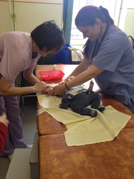 I s-a luat sange din partea “pelviana” intre puta si picior, iar apoi i-a fost pus fluturas pentru a putea primi tratamentul. L-au intepat de DOUA ori!!! Il auzeam cum plangea din camera alaturata, ca nu te lasa sa intrii inauntru! Jur, in momentele acelea esti ce mai buna leguma, nu vorbesti, nu misti si nu stii ce sa faci…