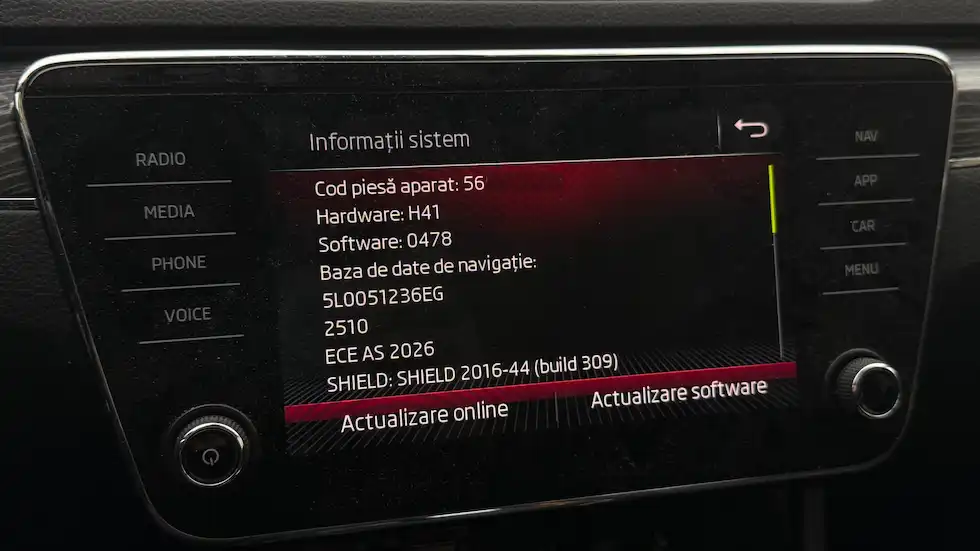 Baza de date radio se actualizează un pic mai greu, are undeva la 200MB și se face din meniul de firmware sau informații sistem. Durează câteva minute, navigația se restartează de vreo 2-3 ori și trebuie să aveți motorul pornit. Eu l-am avut pornit tot timpul.