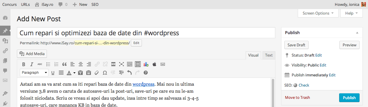 Astazi am sa va arat cum sa iti repari baza de date din wordpress. Mai nou in ultima versiune 3.8 avem o caruta de autosave-uri la post-uri, save-uri pe care eu nu le-am folosit niciodata. Scriu ce vreau si apoi dau update, insa intre timp se salveaza si 3-4-5 autosave-uri, care mananca KB in baza de date.