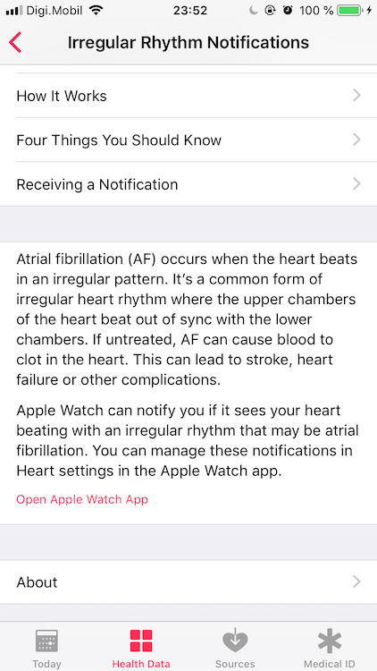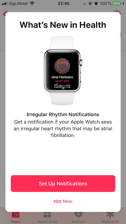La următoarea deschidere a aplicației Health, vi se va cere și activarea notificărilor pentru ritmul neregulat (Irregular Rhythm Notifications). Acestea pot detecta AFib (Atrial Fibrillation).