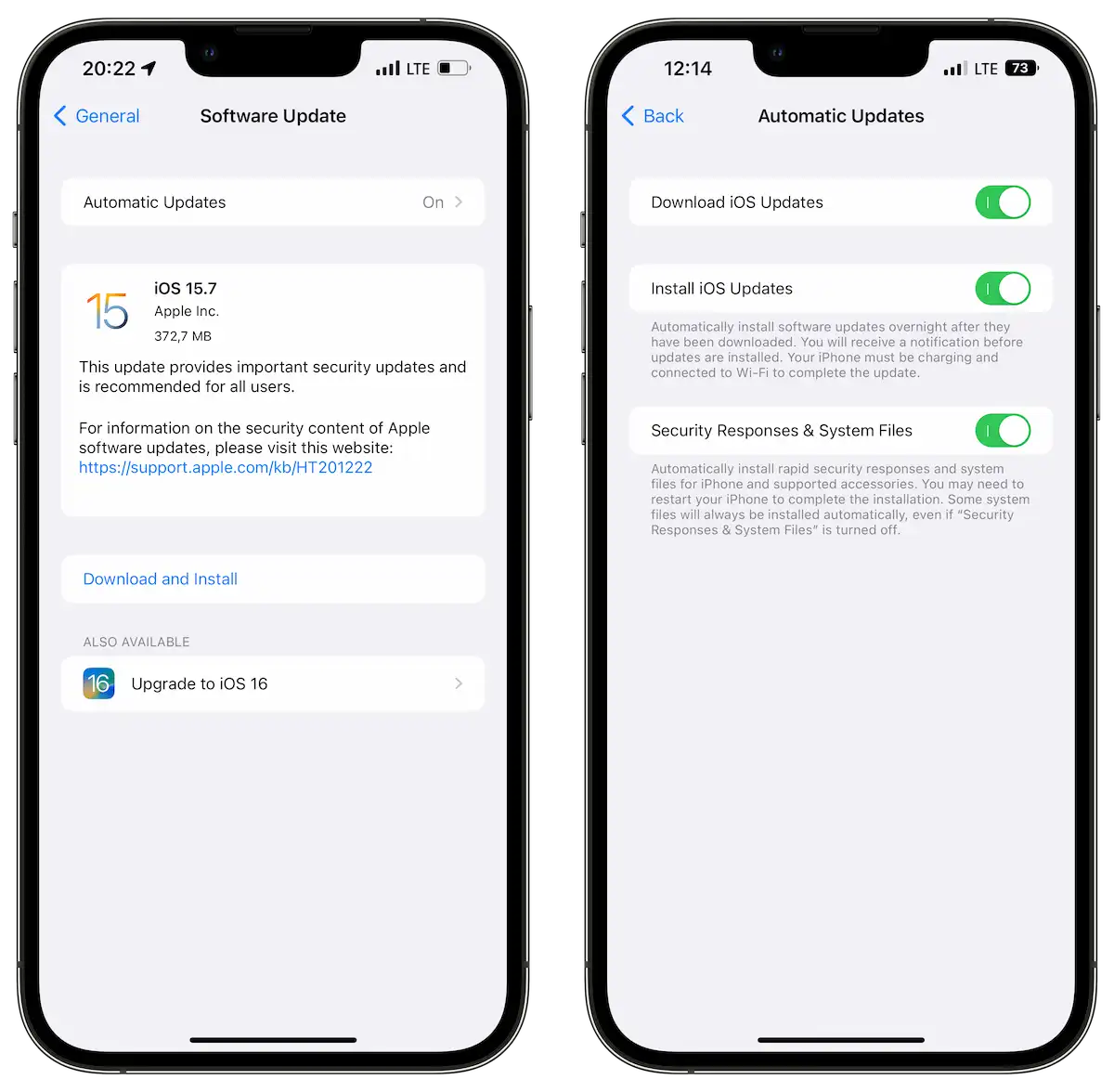 Începând cu iOS 16 vom putea descărca și instala automat o nouă versiune de iOS atunci când telefonul este conectat priză și Wifi. O nouă opțiune de actualizare automată a patchurilor de securitate este adăugată de Apple în meniul Software Update.