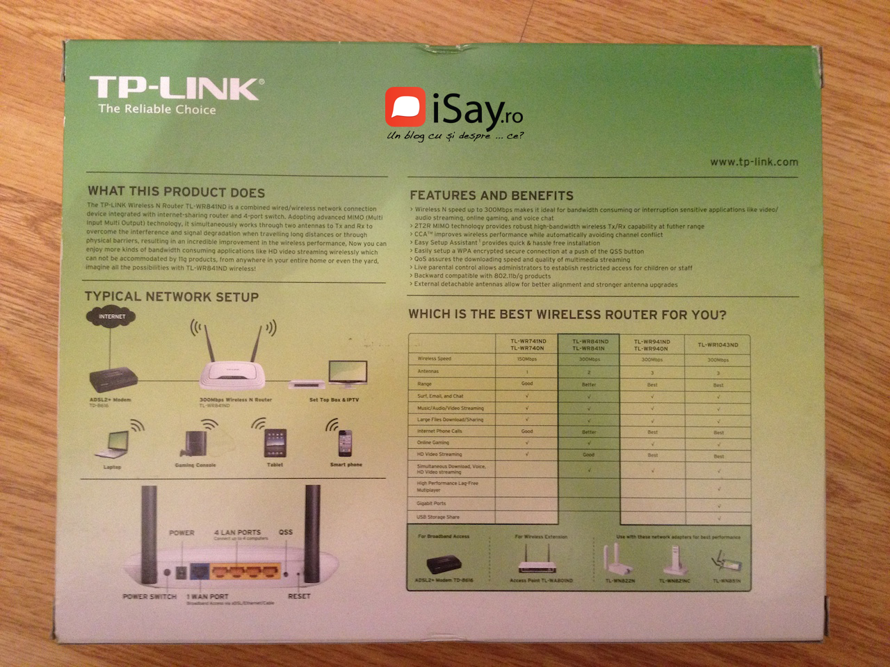TL-WR841ND este un router wireless N 300Mbps care integrează posibilităţi de conectare în reţea prin fir/wireless, proiectat pentru utilizarea în cadrul reţelelor de acasă sau de la birou. Folosind tehnologia MIMO 2T2R, TL-WR841ND crează o conexiune wireless avansată şi de înaltă performanţă, fiind ideal pentru streaming video HD, apeluri VoIP şi jocuri online. Quick Setup Security (QSS) asigură criptarea WPA2 la simpla apăsare a butonului QSS de pe carcasa elegantă, pentru protecţia reţelei împotriva intruziunilor din exterior.